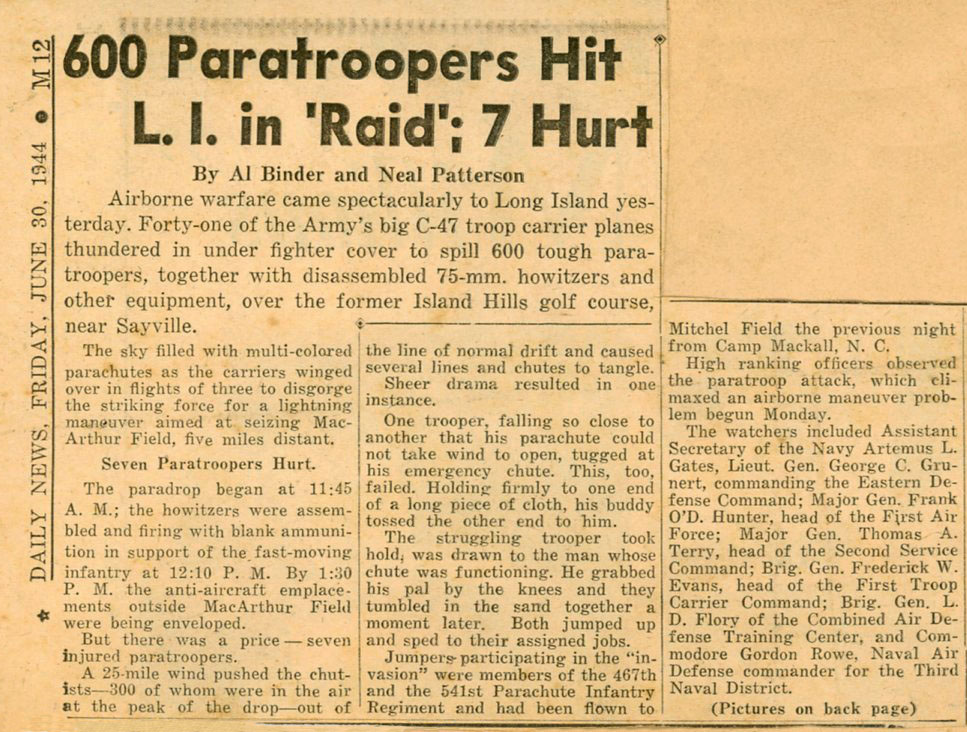 Two months later the jump mentioned in the newspaper article below took place on June 30,1944. The 467th mentioned in the article
