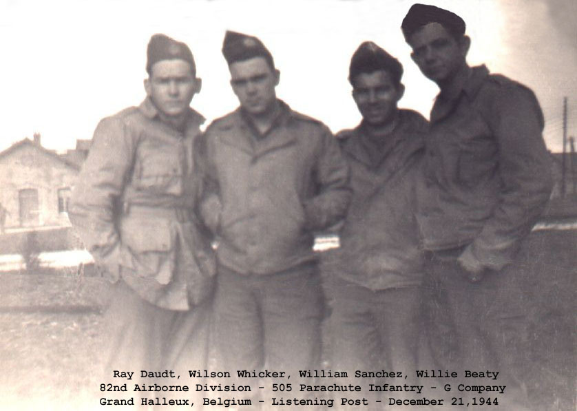 Below, the day after this picture was taken, these four paratroopers were together at a listening post on the east side of the Salm River in the town of Grand Halleux, Belgium. Private First Class William Sanchez and Sergeant Willie Beatie were "killed in action" on December 22nd 1944, when leading elements of the 1st Panzer Regiment attacked their position.