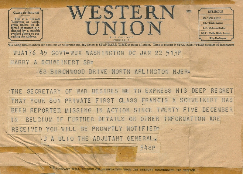 Below; The Western Union telegram sent to the parents of Pfc. Francis X. Schweikert.