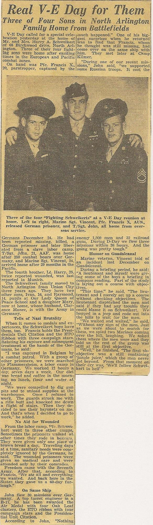 Francis X. Schweikert was born on April 23rd 1925 in Brooklyn, New York, he was the youngest of four brothers that served during WW II. Harry, his oldest brother, earned a battlefield commission with the 410th infantry Regiment in France, brother Vincent served 29 months in the Pacific, with the Marine Corps., and John, in the Army Air Corps. completing 30 missions in a B-17 bomber.