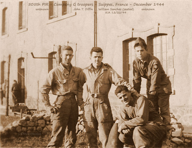 505th PIR Co G 1944 - Unknown trooper, John Diffin, William Sanchez seated, Unknown.