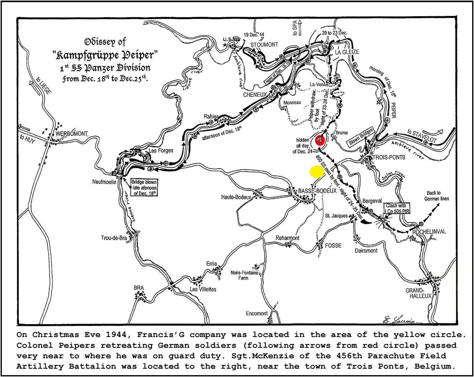 ** Sgt. John D. McKenzie of the 456th Parachute Field Artillery Battalion, 82nd Airborne Division, writes in his book "On Time, On Target", of how his artillery observation team(supporting the 505 Parachute Infantry) at Trois Pont, Belgium became POW's. The observation post was manned by five paratroopers of the 456th, and were overcome by twelve SS men from Colonel Peiper's Kampfgruppe and taken prisoner. (They were part of Peiper's Kampfgruppe of approximately 800 SS men making their way back to German lines on Christmas eve 1944 after running out of fuel for their panzers. On top of having no fuel, the 504th Parachute Infantry (sister regiment of the 505-PIR) gave an awful beating to the Germans at Cheneux, Belgium, on December 20,21, 1944.) Sgt. McKenzie's observation post was only two miles west of Field Marshall Montgomery's new Christmas eve defensive line at Basse Bodeux. (500 to 800 men of Colonel Peiper's Kampfgruppe, were hidden in the red circle area all day Christmas Eve 1944.)