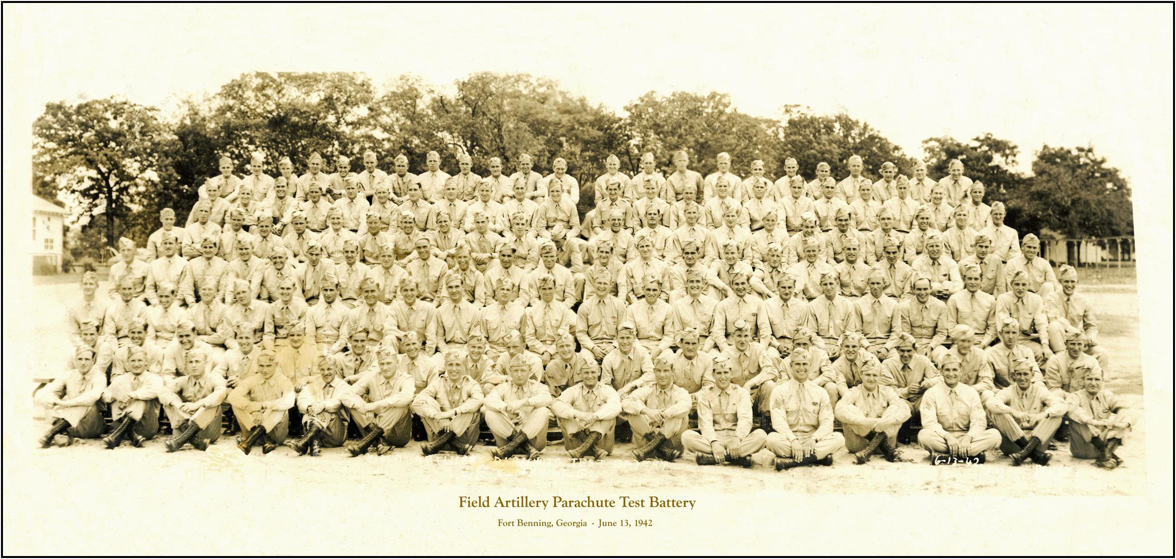 The War Department authorized the creation of a Test Battery in February of 1942 to develop a system whereby artillery is dropped in pieces into combat zones along with field artillery parachutists. Upon landing, the parachutists quickly locate and assemble their weapons, enabling them to provide timely support to parachute infantry units. George was one of 199 enlisted soldiers from Fort Bragg that volunteered for this new type of unit. All participants were required to have earned their jump wings previously.