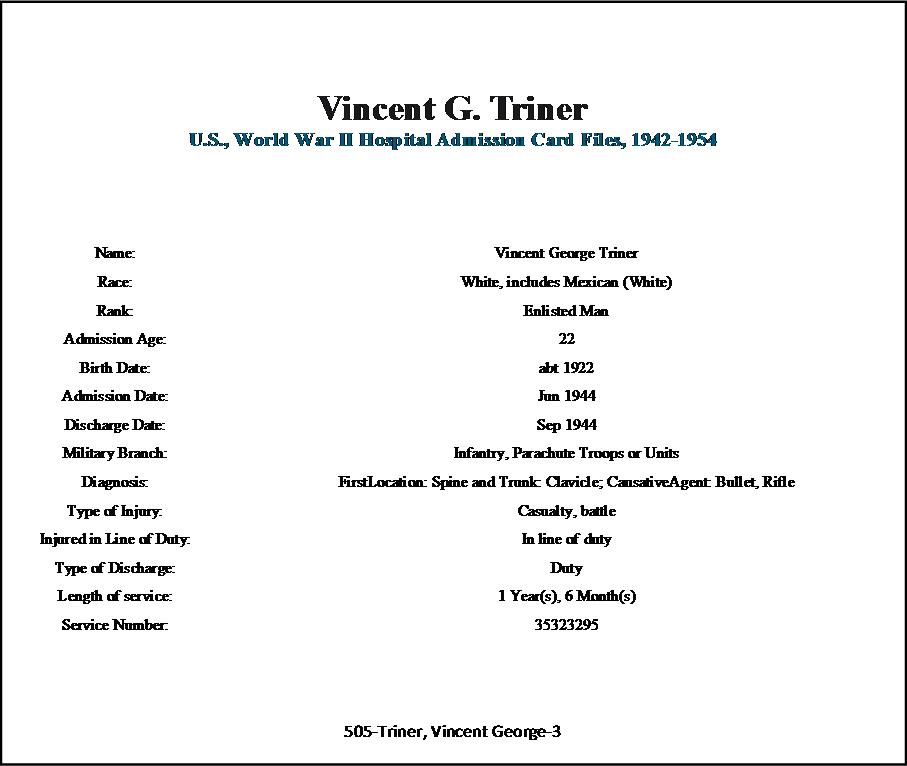 He made combat jumps in Salerno on September 14th 1943, Normandy, St. Mere Eglise on June 6th 1944 and Holland on September 14th 1944. In December 1944, Vincent also fought in the Ardennes, in Belgium (Battle of the Bulge), and the Hurtgen Forest in February 1945. He was honorably discharged on October 7th 1945.